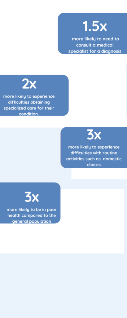 Access to appropriate care is also a challenge. People with MCS are 1.5 times more likely to need to consult a medical specialist for a diagnosis and twice as likely to experience difficulties obtaining specialized care compared to others.