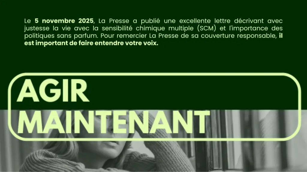 De leur naissance à leur décès, les humains sont constamment exposés et contaminés par une abondance de produits chimiques synthétiques. Cette exposition peut avoir pour effet de modifier les gènes et leur manière de fonctionner, en plus de potentiellement augmenter les risques de développer certains troubles, tels que l’autisme, des allergies et l’asthme chez l’enfant, l’infertilité et des grossesses plus difficiles, certains cancers ainsi que des maladies chroniques cardiovasculaire, respiratoire et des maladies neurodégénératives. La contamination chimique de l’environnement intérieur présente un risque de développer une sensibilité chimique multiple (SCM/MCS). Cette contamination émane de produits parfumés courants, tels que les parfums, les savons, les shampooings, les produits de nettoyage et les assouplissants. De plus, ces personnes qui sont sensibles aux produits chimiques sont également plus susceptibles que les personnes en bonne santé de développer de nombreuses autres maladies chroniques (Statistique Canada).